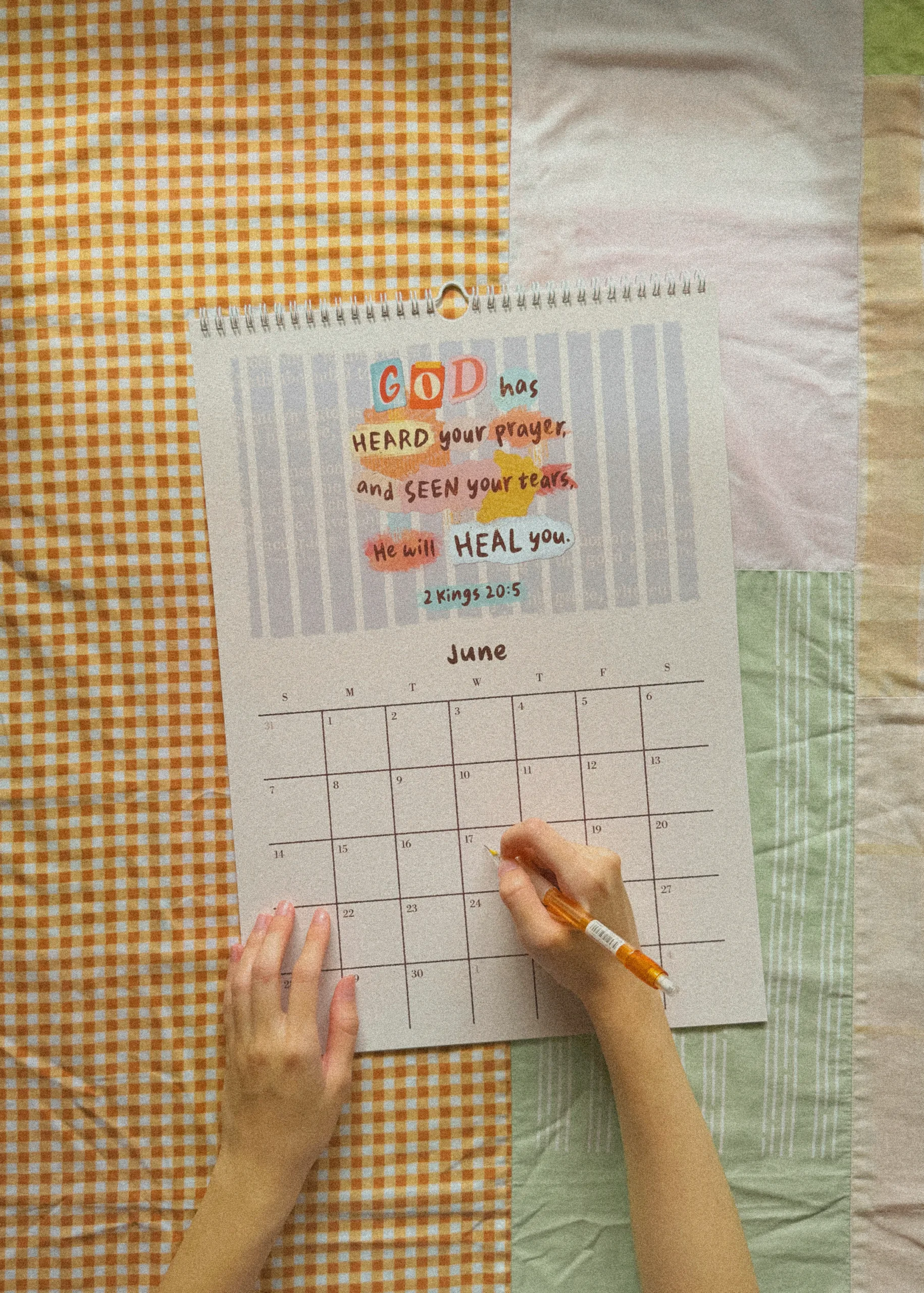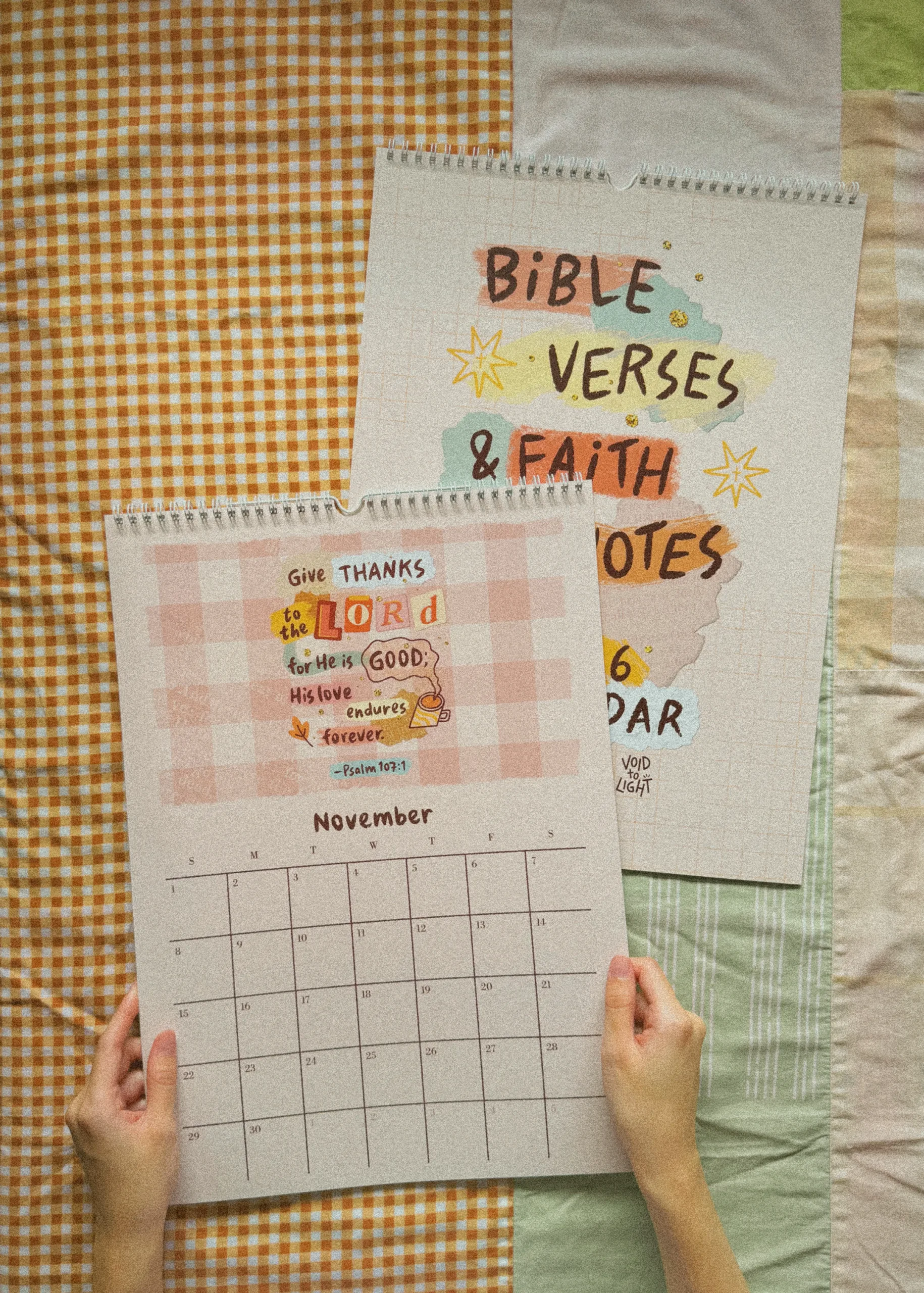Each month features a hand-drawn illustration paired with a verse or encouragement — gentle reminders that God’s Word still holds power in every season. From “The Lord will fight for you. Just stay calm.” (Exodus 14:14) to “Plan your ways, but the Lord directs your steps” (Proverbs 16:9), these are meant to anchor your heart and point you back to Him.